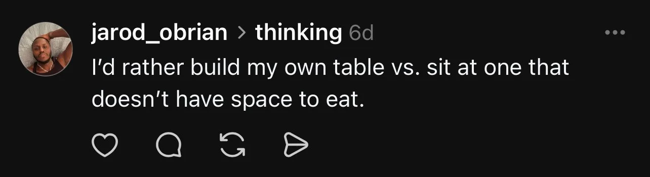 I can’t help but think – I’d rather build my own table vs. sit at one that doesn’t have space for me to eat. Too many moments have left me feeling overlooked, underutilized, unseen, misunderstood, misinterpreted, incomplete, and empty. Various encounters have fostered a false hope that someone wants to partner for a greater cause. Unfortunately, I’ve realized that some people never intended to share a meal; they only wanted table service.